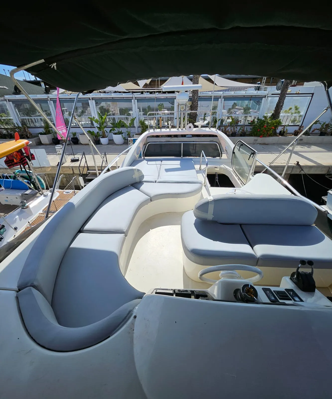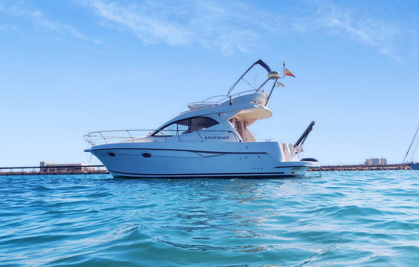 11,30 Metros de eslora Sound System y Bluetooth Fly Bridge Solárium en proa Plataforma de baño WC y Ducha Tablas de Paddle Surf Copa de Cava Premium Máximo 9 personas