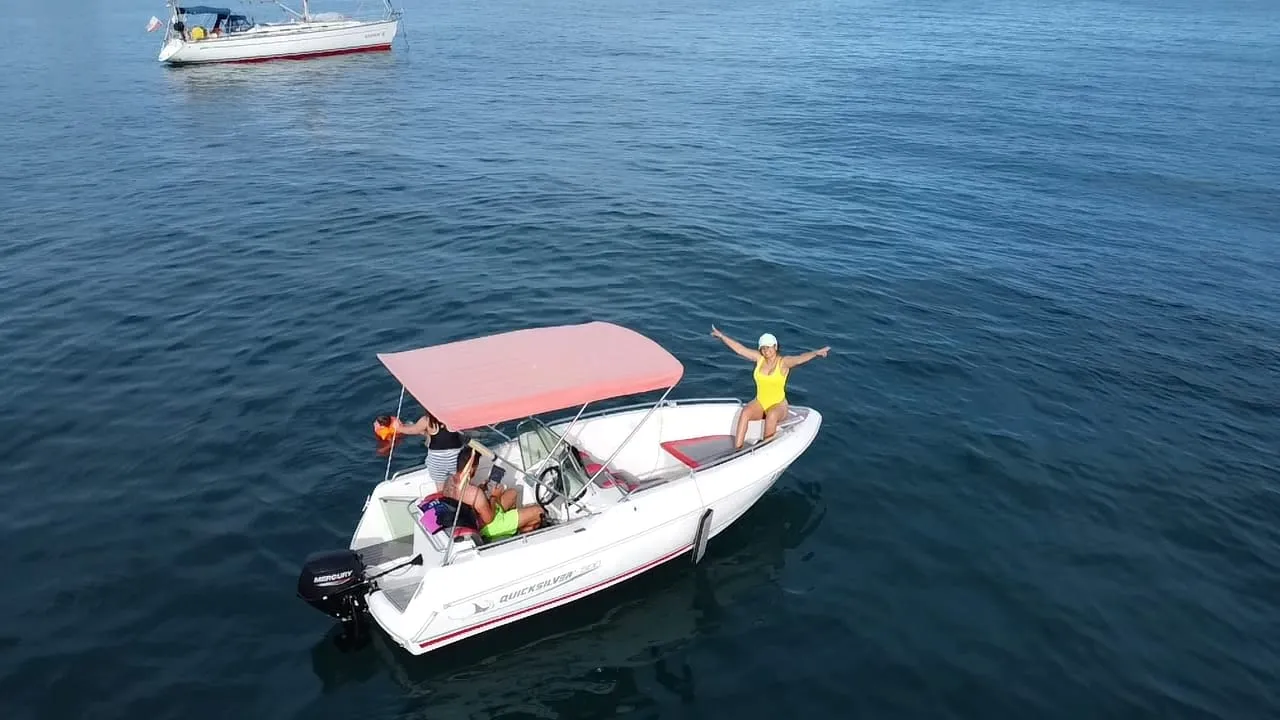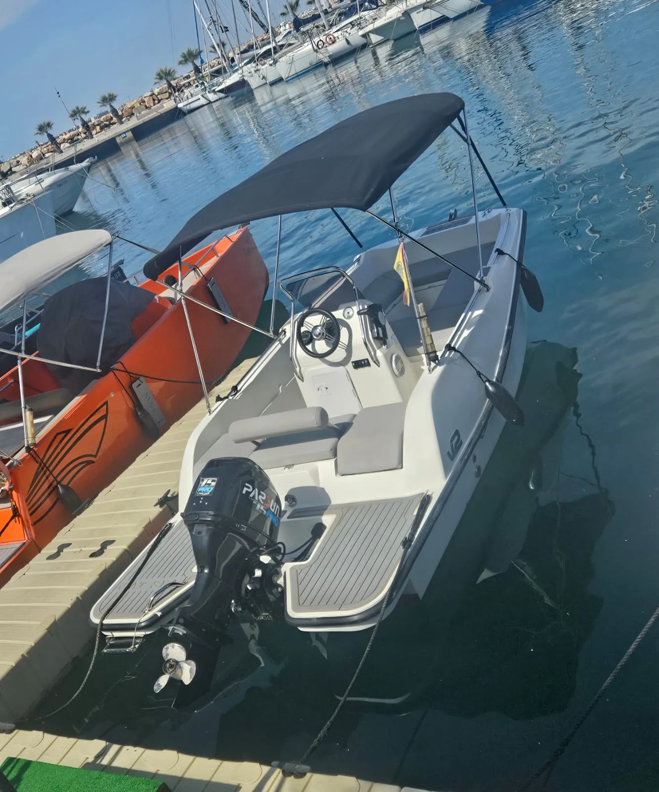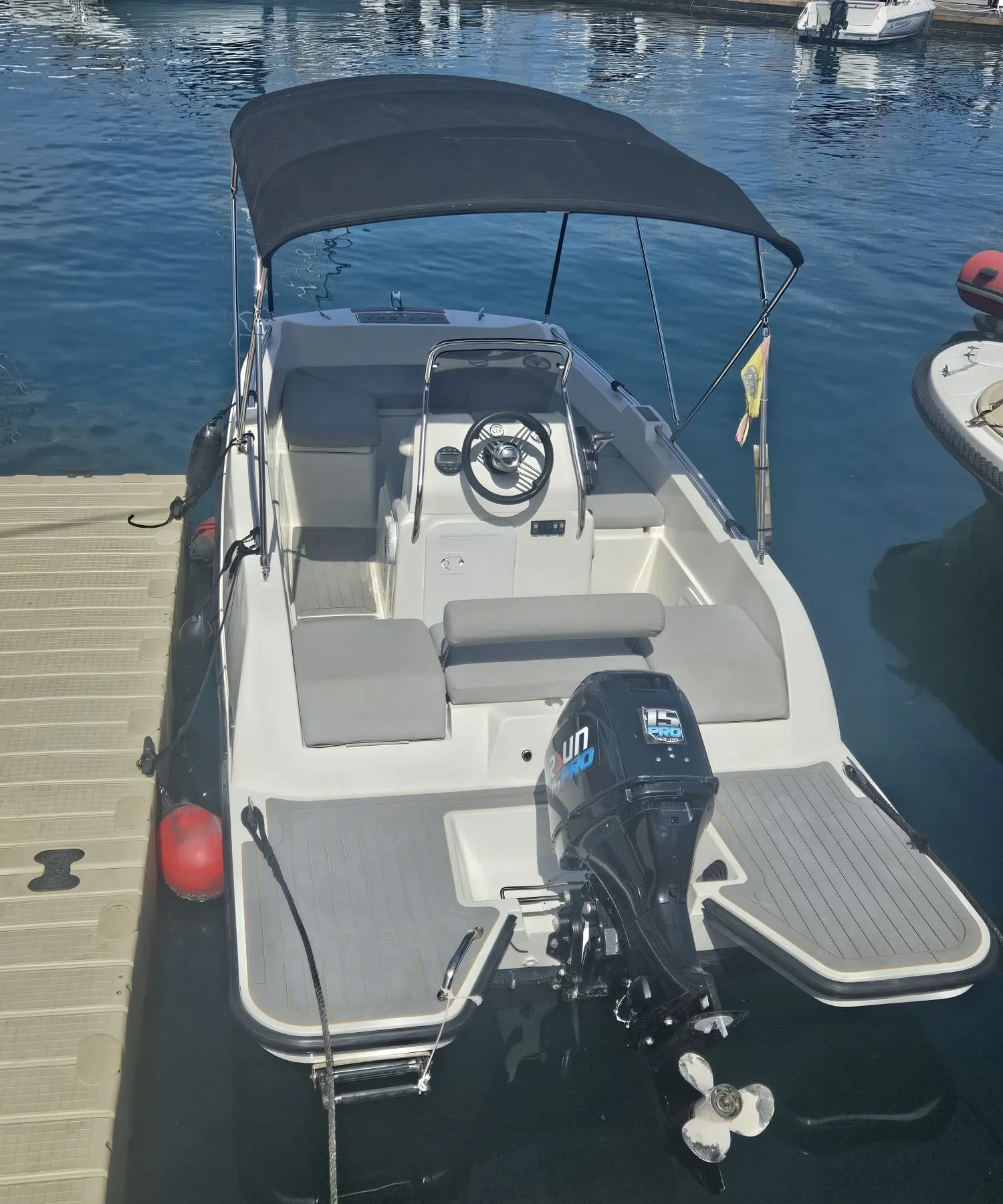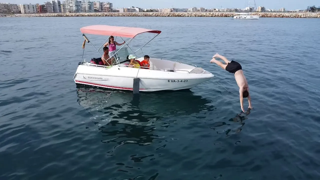 5 Metros de eslora Solarium en proa Escalera de acceso Edad mínima 18 años Motor fueraborda de 15CV Máximo 6 personas Sé tu el capitán